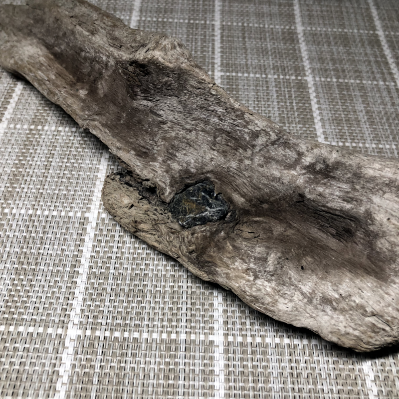生命力を感じさせる美しい曲線が魅力的な流木で、その中にめり込んでいる石が、さらなる存在感を引き立てています。
